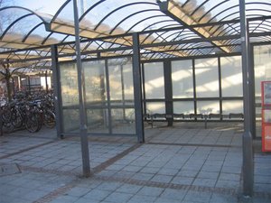 - Errichtung eines neuen Wartehäuschens direkt vor der Bushaltestelle. Der freiwerdende Platz des bisherigen (viel zu großen) Wartebereichs wird für Fahrradständer genutzt, wobei die Rückwand entfernt und die Seitenwände ggf. verschoben werden.
